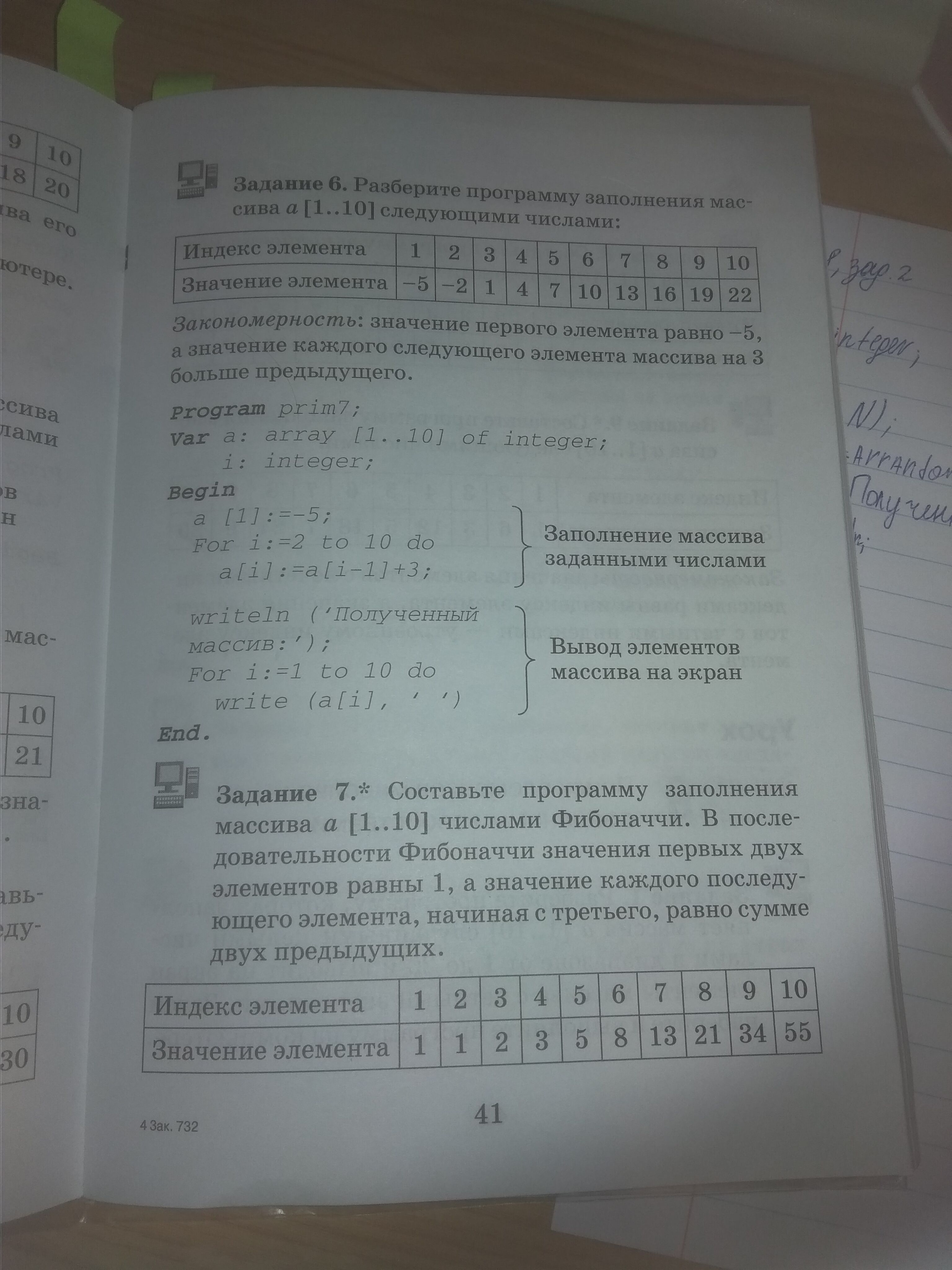 Program prim7; Var a: array[1..10] of integer; i: integer; Begin a[1]:=1; /задаём 1-й элемент массива/ a[2]:=1; /задаём 2-й элемент массива/ For i:=3 to 10 do a[i]:=a[i-2]+a[i-1]; /элемент:=сумма двух предыдущих эл-в/ writeln('Полученный массив: '); For i:=1 to 10 do write(a[i], ' ') End.