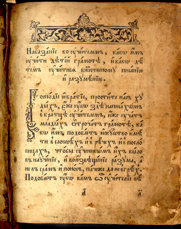Наказ учителям, как им обучать детей грамоте и божественному писанию. Господа и братья, простите нас, здесь написано вкратце об обучение молодых отрочат (детей) грамоте. Как им надо строить свою речь в пословицах, чтобы учение дошло до разума учеников. Чтоб они не позорились и не грешили.