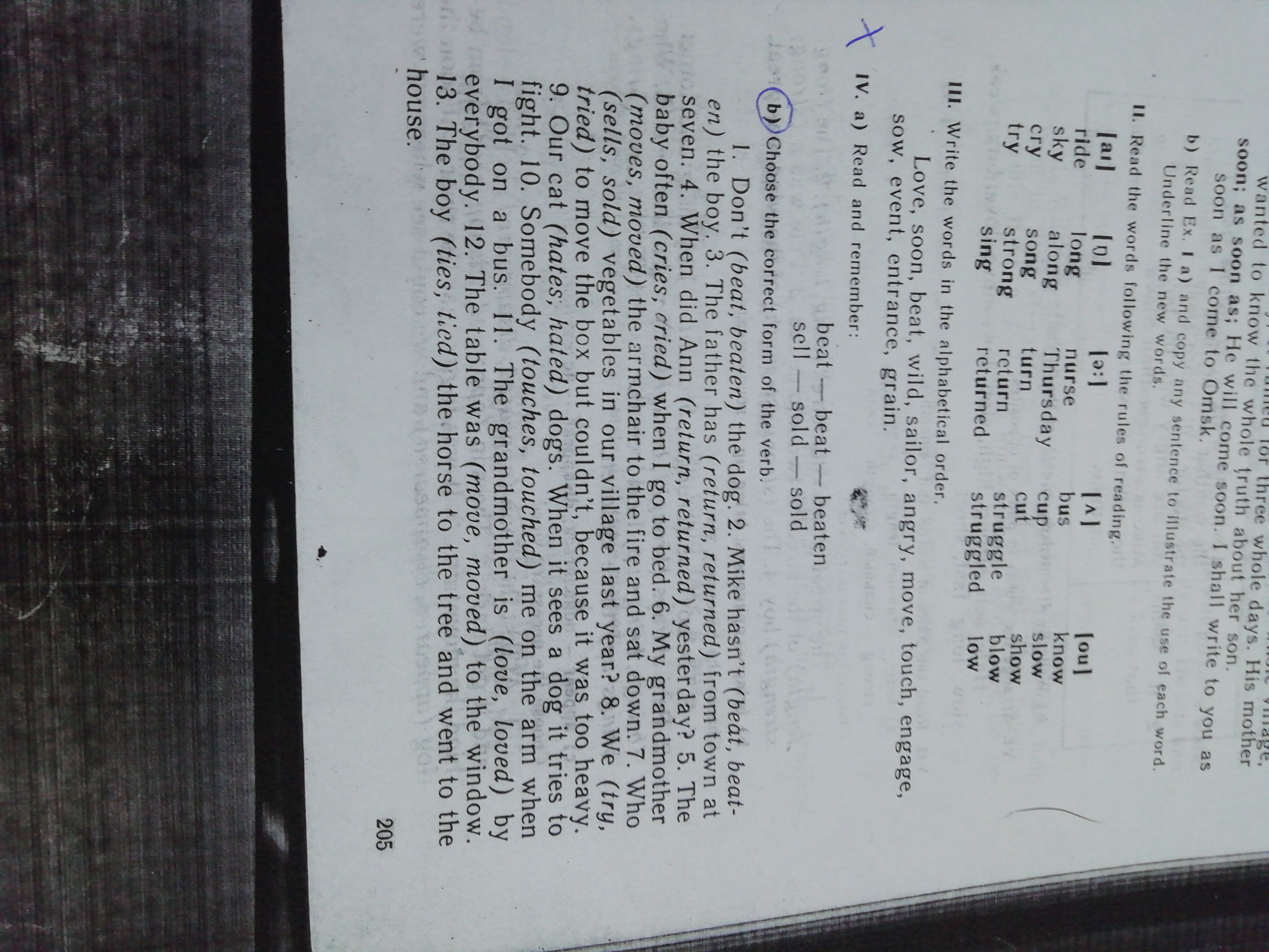 1. beat Не кусай собаку 2. beaten Майк не кусал этого мальчика 3. returned Отец вернулся из города в семь. 4. return Когда Энн вернулась вчера? 5. cries Ребенок часто плачет, когда я ложусь в кровать 6. moved Моя бабушка подвинула кресло к огню и села 7. sold Кто продавал овощи в нашей деревне в прошлом году? 8. tried Мы попытались подвинуть коробку, но не смогли, потому что она была слишком тяжелой. 9. hates Наш кот ненавидит собак 10. touched Кто-то тронул меня за руку, когда я сел в автобус 11. loved Наша бабушка любима всеми 12. moved Стол был подвинут к окну 13. tied Мальчик привязал лошадь к дереву и пошел к дому.