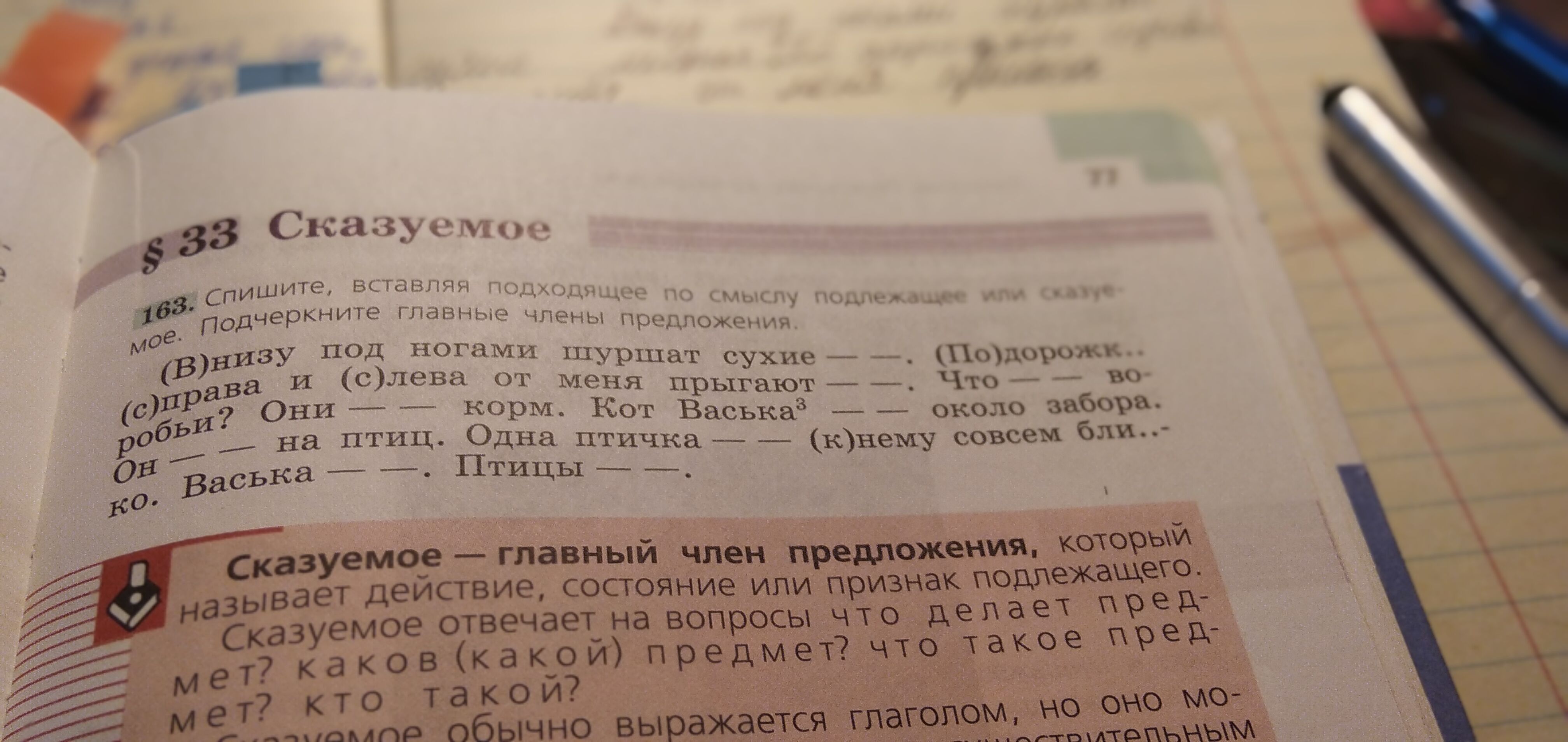 Внизу под ногами шуршат (сказ) сухие желтые листья (подлеж). По дорожке справа и слева от меня прыгают (сказ)весёлые воробьи (подлеж). Что там делают (сказ) воробьи? Они (п) едят (сказ) сухой корм. Кот Васька (п) мягко идет (сказ) около забора. Он (п)хищно смотрит (с)на птиц. Одна птичка (п) неосторожно подлетела (с)к нему совсем близко. Васька (п) кинулся(с) на птицу. Птицы(п) мгновенно улетели (с) (п) - подлежащее (с) - сказуемое