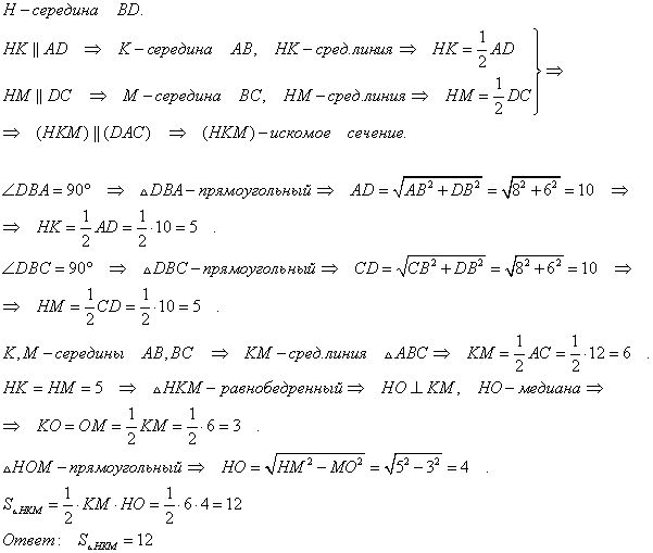 в тетраэдре DABC угол DBA=DBC=90 градусов, DB=6, AB=BC=8, AC=12. постройте сечение тетраэдра плоскостью, проходящей через середину DB и параллельной плоскости ADC. Найдите площадь сечения.