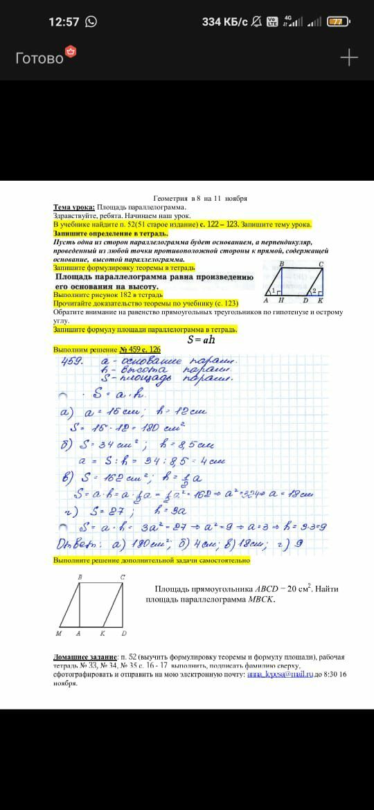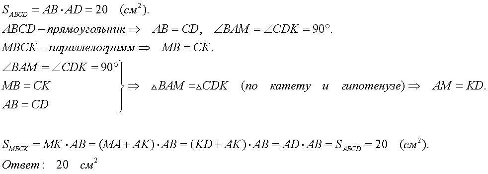 Площадь прямоугольника abcd - 20cm² . Нати площадь параллелограмма mbck